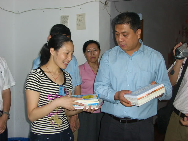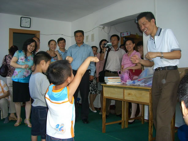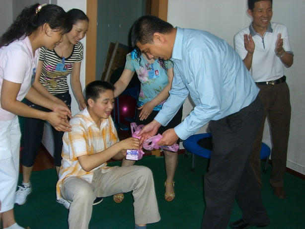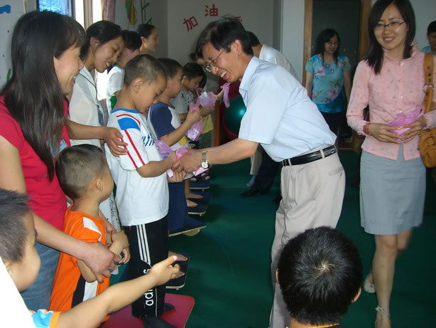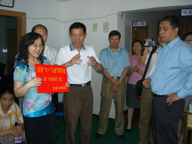 在六一儿童节来临之际,由宜昌市品牌建设工作小组、市总工会、市妇联、团市委、市残联、市慈善协会组织的“关爱与欢乐同在”大型慰问活动,于五月二十七日拉开序幕。下午二时,由宜昌市品牌建设工作小组副组长黄晓波、团市委副书记宋涛、市妇联韩副主席等组成的慰问组一行,在市残联高潮理事长及各媒体记者的陪同下,来到我校对师生进行慰问。他们参观了教室、训练室、活动室和学生寝室,观摩了学生的教学和训练,并向冉存英校长详细询问了学校建设,管理、训练效果等情况。当他们得知已有八九名学生在我校训练后,已回到普通学校就读后非常高兴。随后他们来到感统训练室,向老师和学生赠送了日用品、学习用品及书籍等,老师和学生合唱了《感恩的心》,将慰问活动推向高潮。