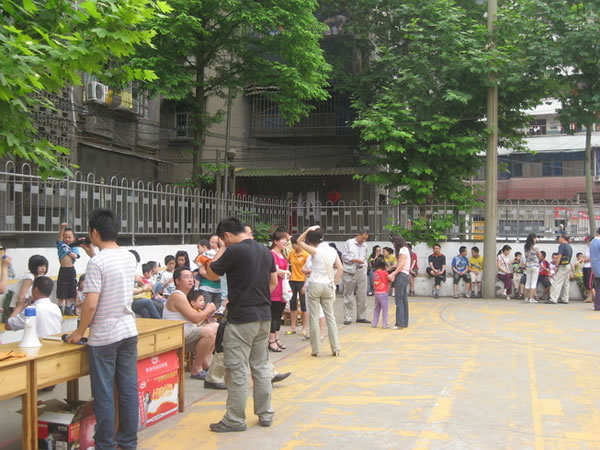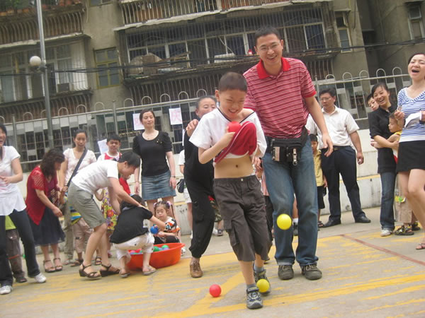 当音乐嘎然停止,家长要抢坐板凳,没有抢到的那组就被淘汰。第二回合拿走一个板凳,剩下