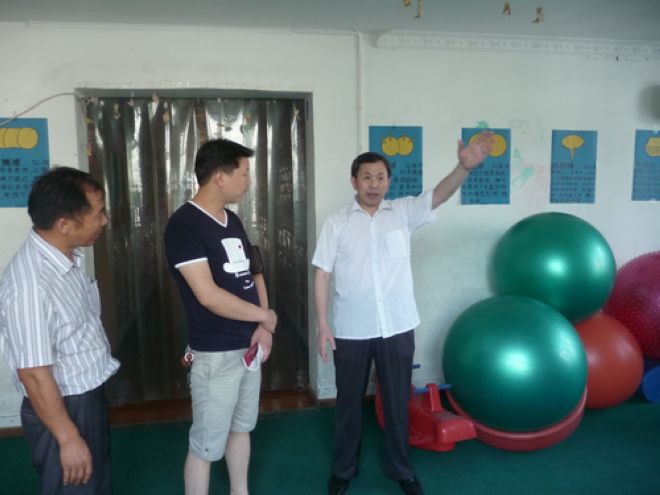 汪主任(右一)介绍我校感觉统合训练厅的情况