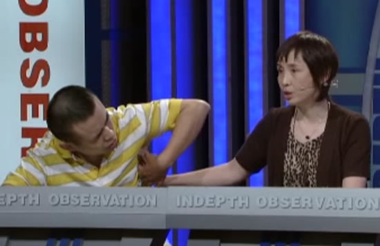 当文章提出要单独带杨弢出去时,杨母和文章确认“会不会有问题”,这并非仅仅出于母亲对儿子的保护。在本期《深度观察》录制过程中,杨弢就突然做出让现场观众和录制人员都很意外的表现。一直颔首不语的他,猛然从座位上站起,表情略显愤怒,他直角直线地走到主持人马丁身旁,正当所有人都在观察猜想他的举动时,他抬手重复拍打马丁,起先马丁也很意外,但他似乎联想到李连杰在电影中被文章突然攻击时的反应,然后他微笑着缓慢退让。直到主持人马丁退让到录制棚侧幕条后,杨弢停止拍打,像达到目的的孩子一般,他捂着嘴笑了笑,然后他又直角直线地走回到母亲身旁,像犯错的孩子那样不好意思地低下头。母亲田惠萍背对杨弢,向儿子明示自己生气了,之后杨弢在工作人员陪伴下离席。重新回到主持台上的马丁笑呵呵地问杨母“为什么我会挨打呢?”,杨母解释,这没有办法,她希望更多人能从中明白,这就是自闭症患者随时可能产生的状况。