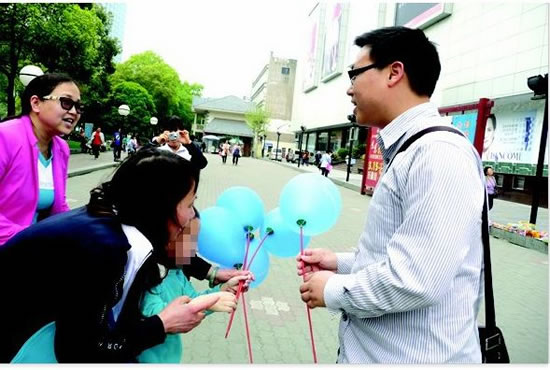 孩子在老师帮助下给路人发蓝色气球。 记者郝李平 通讯员谭玲丽 摄