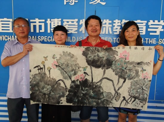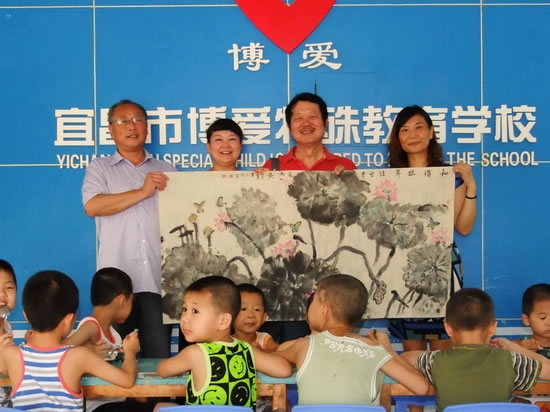 图:2013年7月24日,北京著名画家李元德(右二)向湖北省宜昌市博爱特校赠送价值10万元的水墨画。