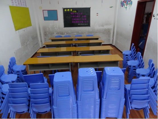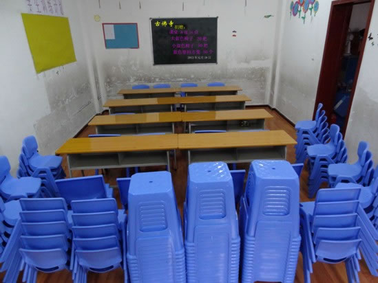 2013年1月19日,在宜昌市第八节腊八节的活动中,古佛寺住持根定法师向我校捐赠人民币5000元整,用于更换学校破损严重的课桌椅,便于孩子们更好的学习和训练。 附5000元善款购买的物品和费用清单 课桌8张16位 1400元 大蓝色椅子20把 1200元 小蓝色椅子50把 1400元 蓝色方凳50个 700元 桌椅送货上门运费:505元 银行转帐:5元 总计:5210元
