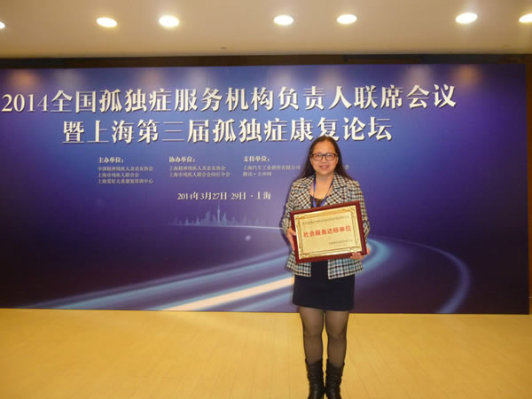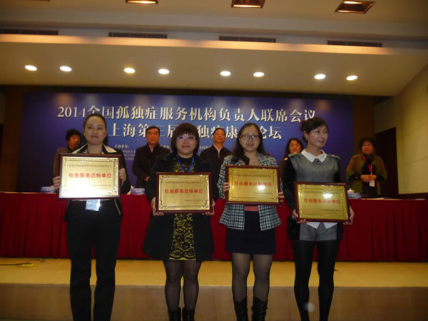 在2013年孤独症服务机构自强自律创建活动中,学校通过完善各项管理,提升教学质量,顺利通过2013年孤独症服务机构自强自律创建活动考核,成为“社会服务达标单位”, 学校冉存英校长等一行赴上海领取自强自律创建活动奖牌,中残联副主席王新宪为学校颁发奖牌。