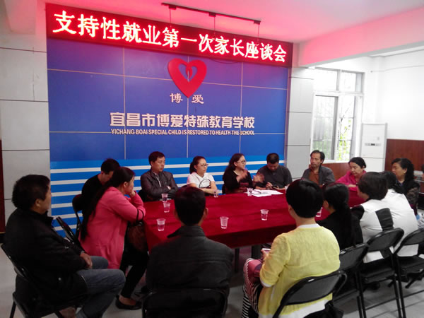 2014年5月9日下午3:30,在宜昌市博爱特殊教育学校一楼大厅召开了支持性就业第一次家长座谈会,会议由学校支持性就业项目负责人周燕老师主持,冉存英校长主讲,一共有16位家长现场参加了会议。
