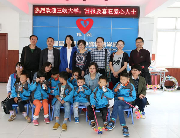 2014年10月14日下午,三峡大学校团委徐纯副书记、谭静主任,三峡日报发行部叶莉主任、王文军主任、古中伟站长及喜旺公司许勇总经理一行来到我校,看望师生,并给孩子们带来玩教具、文具和酸奶等礼物。
