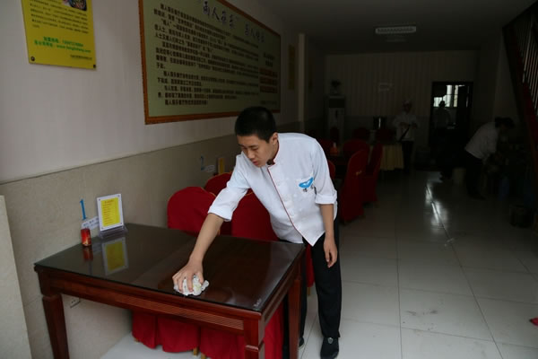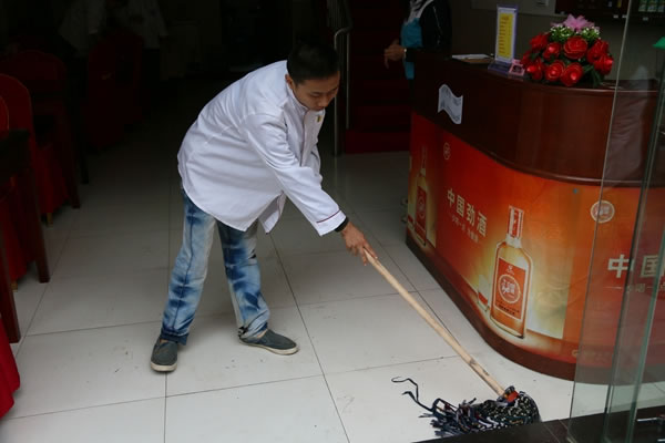根据分工,小峰会在来到餐厅后先把大厅的地拖一遍,有不少细节的地方还不能很好的完成,需要老师的辅助!
