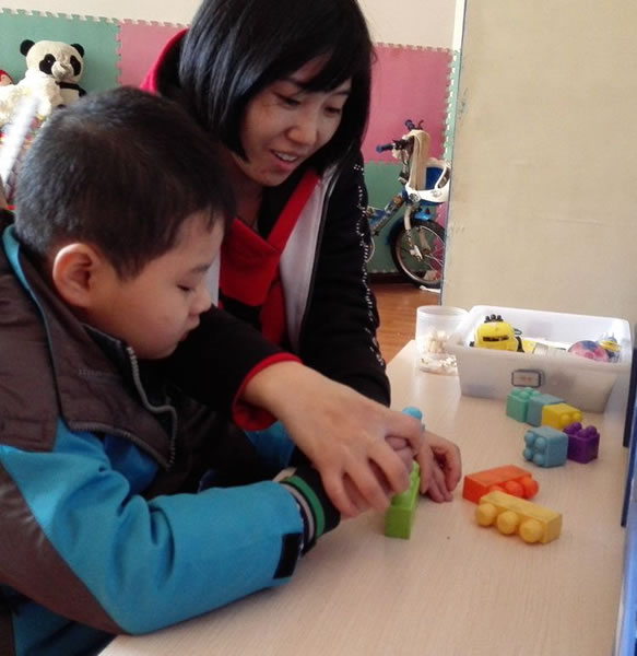 老师正在给孩子上课,手把手的教孩子搭积木!