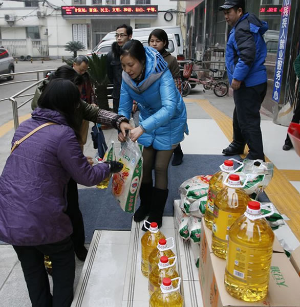 谭校长为大家分发米和油