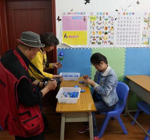 在活动中,志愿者分成不同的小组与孩子们互动,迪特摄影俱乐部的摄影老师们和孩子们制作绢花、大学生志愿者则与孩子们一起玩击鼓传花的游戏,让每个孩子都感受到社会的关爱。