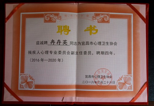 日,宜昌市博爱特殊教育学校校长冉存英同志被聘为宜昌市心理协会残疾人心理专业委员会副主任委员。