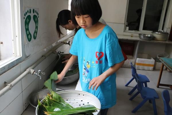 2016年6月8日一大早,孩子们和家长们就开始忙了,刷洗蒸煮粽叶。