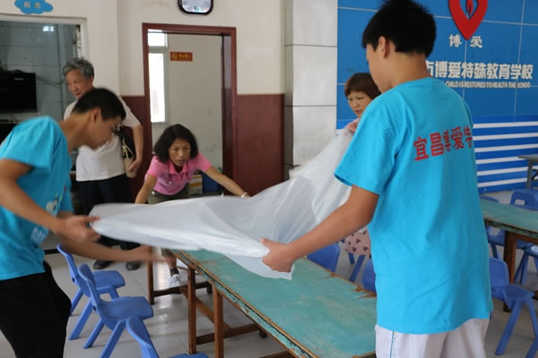 老师孩子们齐动手,为咱们下午的“包粽子”大赛,布置场地。
