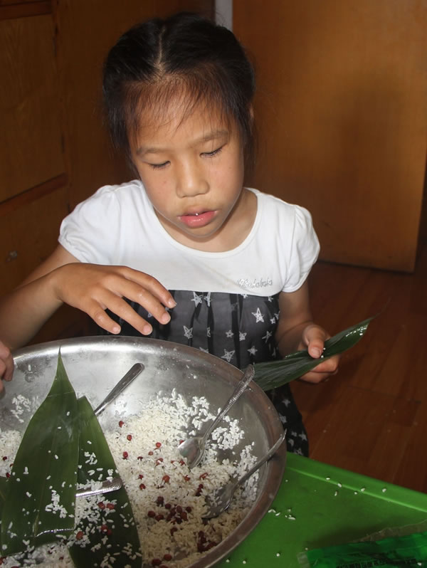 秋秋在仔细的把粽子包严实,可不能漏出来了哦。