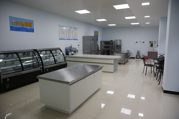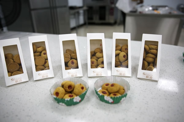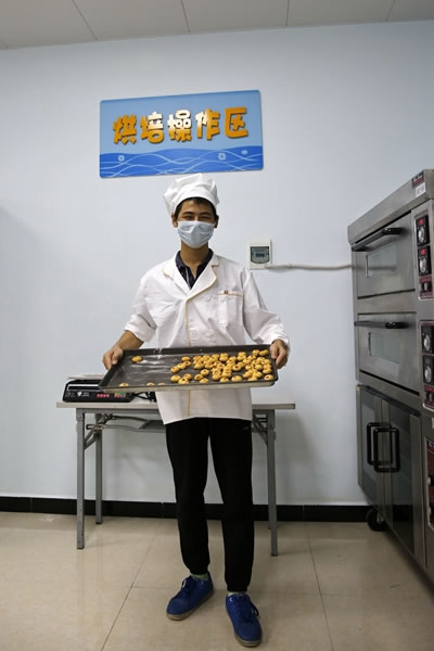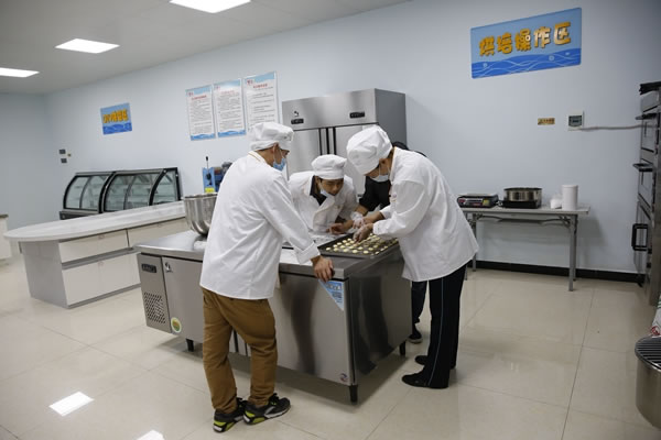郭科长一行参观了整个基地的建设和布置,观看了学员们在就业辅导员的辅助下进行手工制作、模拟超市和糕点烘焙的培训过程。当看到烘焙操作区学员们在糕点师傅的指导下学习花式饼干的称重、成型和造型的制作,并成功作出香喷喷的产品时,不禁露出了赞许的笑容。