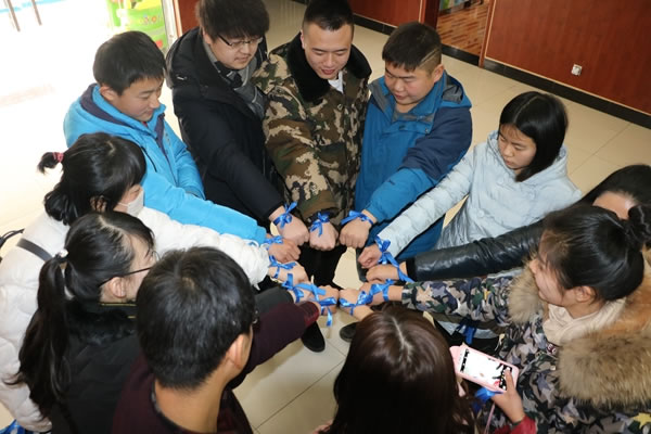 他们和孩子们一起都系上了蓝丝带,传递出他们对这个群体的鼓励、关怀和爱,体现彼此的价值所在。