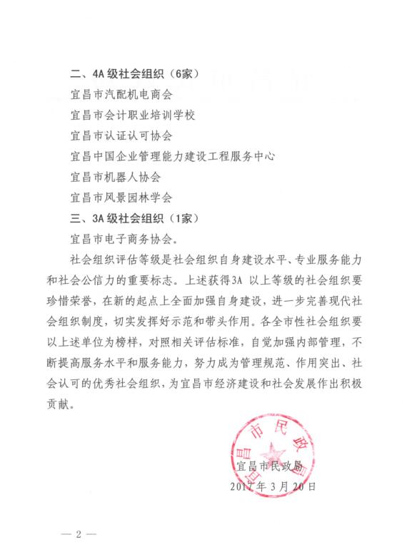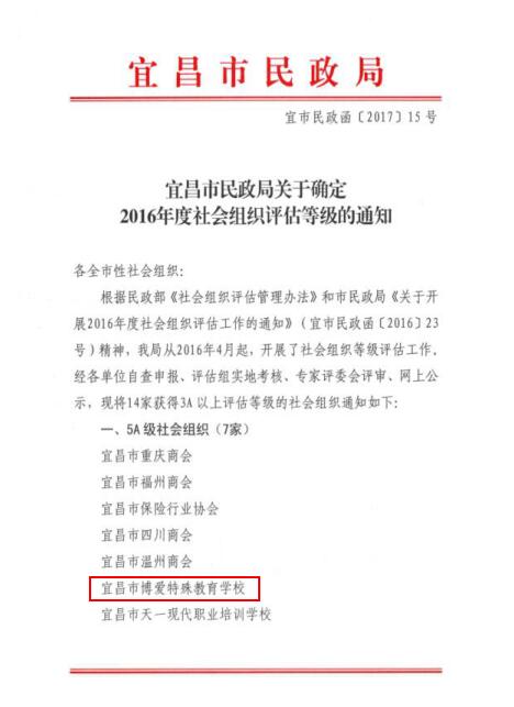 2017年3月20日,宜昌市民政局2016年社会组织评估结果揭晓,宜昌市博爱特殊教育学校荣获中国社会组织评估最高等级——5A级社会组织荣誉称号。标志着我校建设跃上新台阶,进入宜昌市一流社会组织行列。