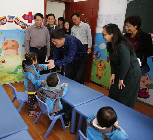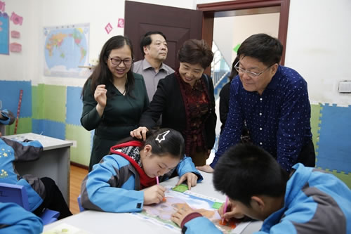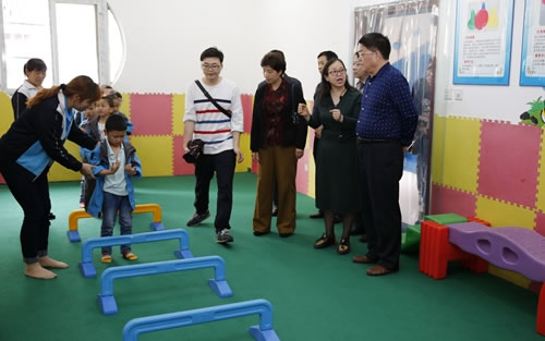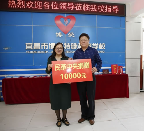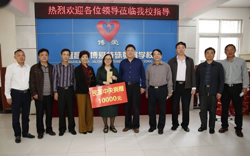 校长冉存英向各位领导汇报了学校运行情况,陪同领导实地观看了学生康复训练课。修福金副主席详细询问了学校现在的运行状况和存在的困难,对小龄自闭症儿童针对性的个别化训练、小组训练和感觉统合训练相结合的教学模式;大龄自闭症青少年生活自理训练、技能训练和支持性就业相结合的训练模式表示高度的赞同,充分肯定了学校在自闭症儿童康复教育中取得的工作成果,并代表民革中央为学校捐赠10000元爱心款。修福金副主席满怀深情的说:“虽然这些钱不能解决太多的实际问题,但代表了民革中央的一片心意,今后将继续坚定的为残疾儿童及家庭服务,继续坚持做好这些好事、实事。”并通过学校向学生、家长和老师表示亲切的问候。伍家岗区区委统战部也为学校捐赠了5000元爱心款。