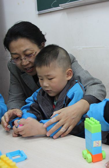 宜昌市教育局副局长翟秀刚、宜昌市残联副理事长孙万清和孩子亲切交谈
