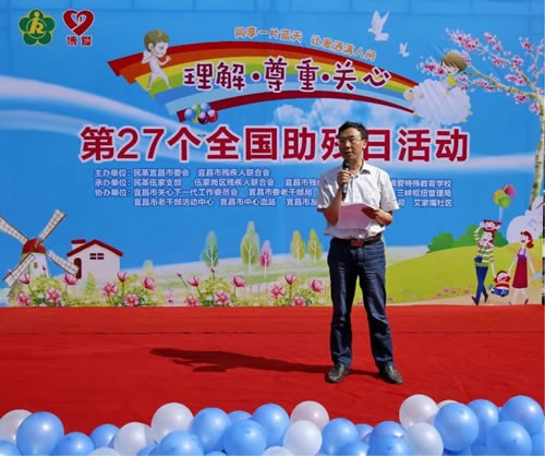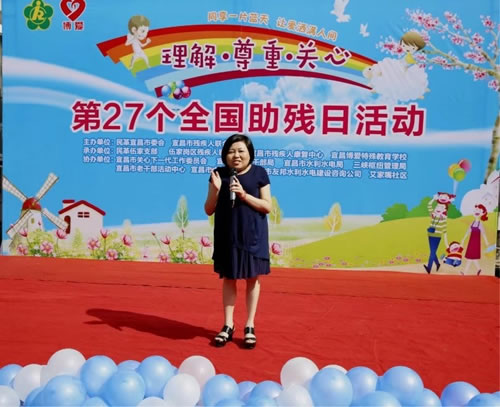在活动中,冉存英校长致欢迎辞,宜昌市残联副理事长孙万清、民革宜昌市委会副主委黄柏权分别发表热情洋溢的讲话。随后,进行了爱心单位帮扶捐赠仪式。大家用浓浓的爱温暖着星星的孩子,同时也激励着我们永不放弃!大家用自己的行动承担着社会责任,传承着中华民族的传统美德。
