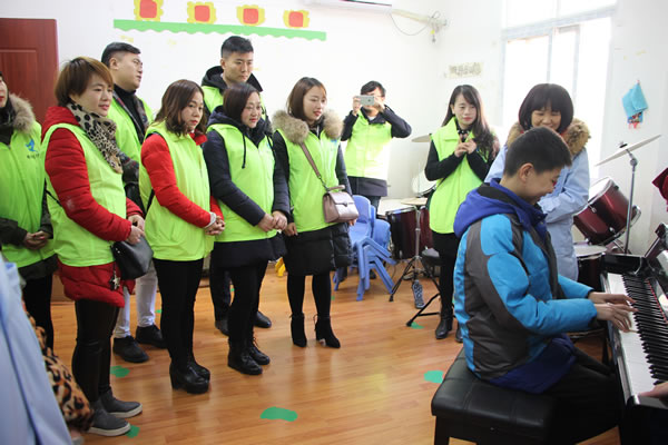 2017年12月19日下午,艳阳高照,今天的天就像是我们的心情,远远望去,一片透明的蓝天,像张丝手帕,蓝天上停留一些细碎而洁白的云块,像是绣在丝帕上的花朵。宜昌市博爱特殊教育学校迎来了一群可爱的志愿者们,他们是青鸟社志愿者,他们一行十余人,参观学校,在参观过程中,观摩孩子们的上课,赫赫小朋友还给他们弹奏了一曲《暖暖》。