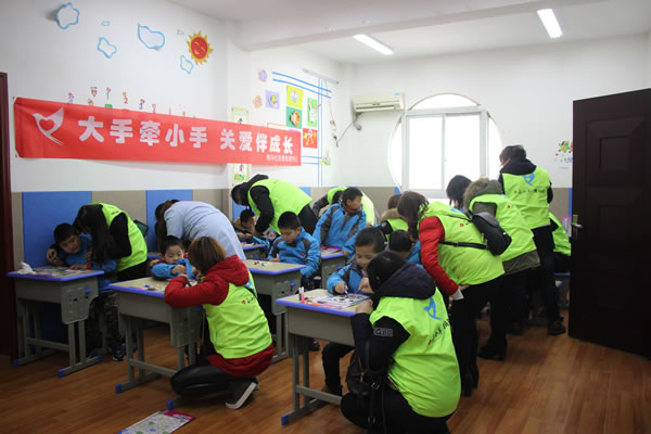 志愿者和孩子们合影留恋,定格美丽的画面。