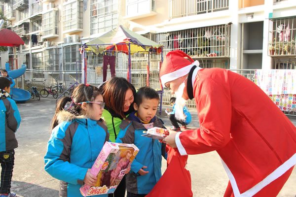 圣诞老人派发大礼包啦,孩子们争先恐后的围着圣诞老人。