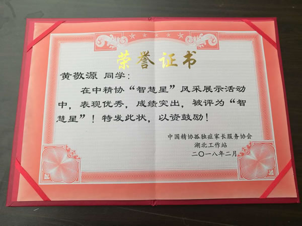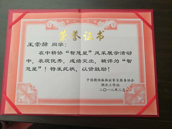 2018年2月3日,由中国精神残疾人及亲友协会、湖北省残疾人联合会、中国精协孤独症家长服务协会湖北工作站主办的“星耀荆楚 为爱起航”智慧星风采展示在武汉市隆重进行。来自宜昌博爱博爱学校的王崇赫同学表演的葫芦丝独奏《欢乐的泼水节》脱颖而出,获得了台下一阵阵热烈的掌声。同时,博爱特校学生“黄敬源、王崇赫”荣获“智慧星”荣誉称号!赫赫爸爸在展演结束后喜悦之情溢于言表,激动的表示,感谢宜昌博爱学校精心培养,让孩子在不断进步的同时,还能争取到各种社会融合的平台展示风采,让孩子更加阳光,自信。