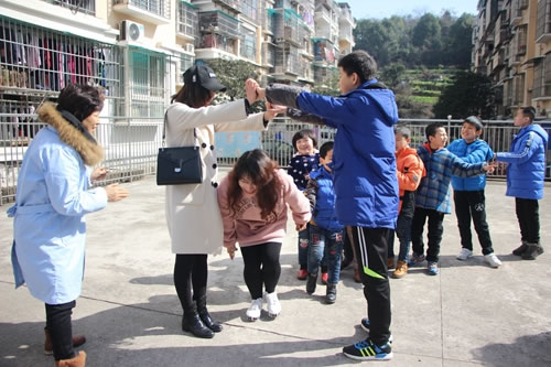 孩子们品尝了美味的点心后,蔡老师和王总与孩子们一起玩起了“跟我一起做,开小火车”等互动游戏,大家玩的开心极了。