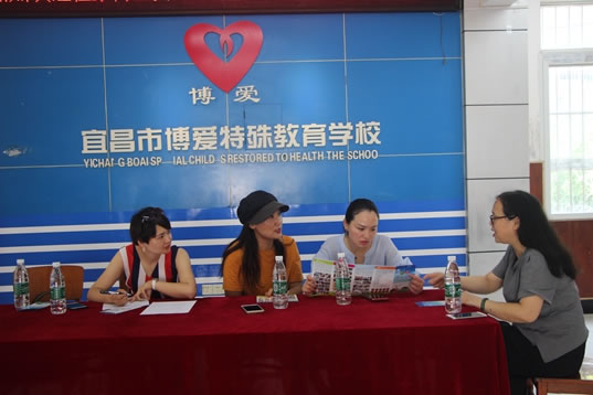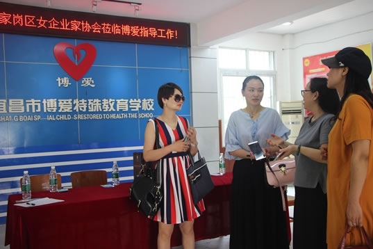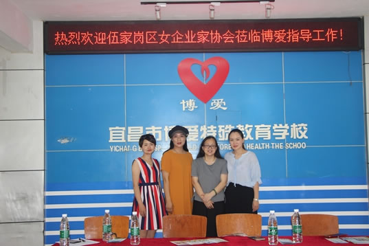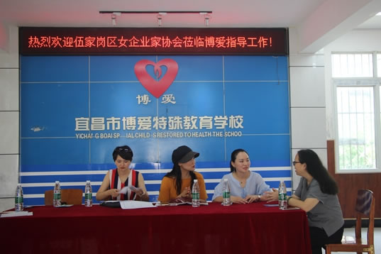 2018年6月6号上午宜昌市自闭症儿童康复中心(博爱特校)迎来了伍家岗区女企业家协会副会长彭珊,伍家岗区女企业家协会理事杨艳及伊爱莎国际美容连锁营销部张经理,宜昌市伍家岗区女企业家协会会员宜昌市自闭症儿童康复中心(博爱特校)的冉存英校长亲自接待,并向他们一行介绍学校的情况。