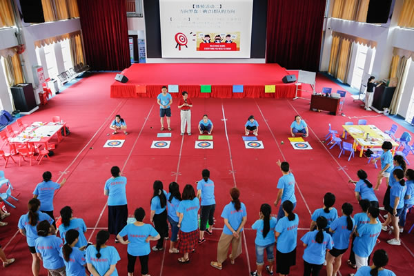 终于,我们遇到了资源连结这个游戏。大家都很积极地参与,集思广益,把有限短的东西想办法接起来变长,如:把卡用透明胶接起来,把笔用透明胶缠起来,把餐巾纸撕成条贴起来等。这样一个人能在有限的时间,把同类的东西放得长一些。最终,我们第二组在第一天最后的游戏中获得了第一。我们知道了团队中的牵引力(如何组织管理、如何带动)、向心力(如何劲往一处使)、推动力(如何激发每个人的激情)的重要性,也体会到了自己的重要性,了解了团队的使命与愿景目标的重要。