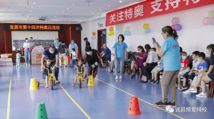 宜昌市第十四次特奥日活动今天在市残疾人康复中心举行,本次特奥日活动由宜昌市残疾人联合会主办,宜昌市残联宣文维权部、宜昌市残疾人康复中心承办,宜昌市自闭症儿童康复中心(市博爱特校)、宜昌市艺萌聋儿康复中心等康复机构协办。全国特奥日是中国残疾人联合会、教育部、民政部、国家体育总局联合发文设立的节日,时间定为每年的7月20日,今年的主题为“参与特奥、促进健康”。受疫情影响,为了不人数较多聚集,本应康复机构一起参加的活动,分3天举行,宜昌市自闭症儿童康复中心(市博爱特校)有幸在特奥日当天举行第一场活动,本次活动分线下参与、竞技和线上直播、同步参与两个部分。