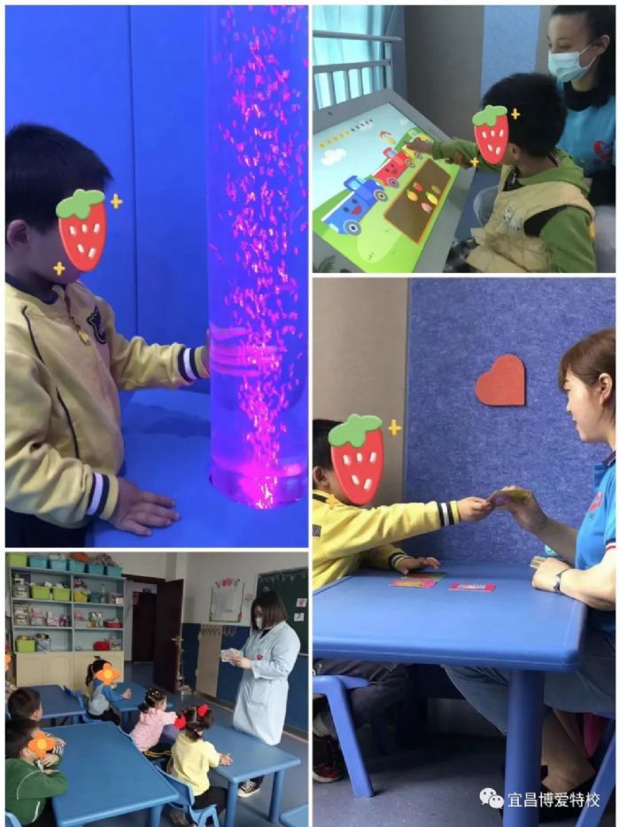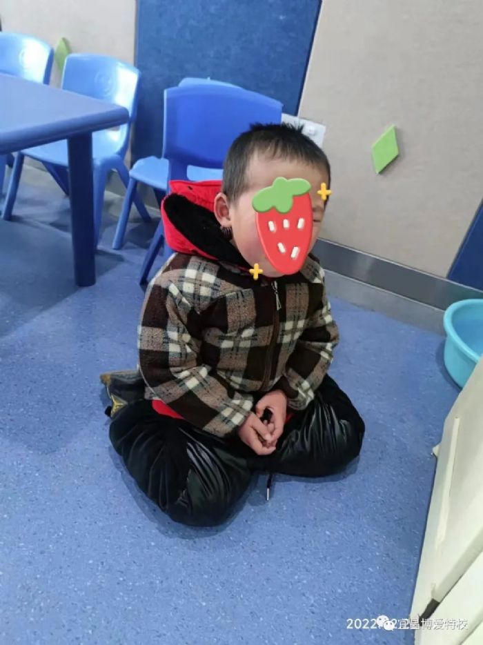 初进星星班的鑫鑫,也许是第一次进入集体生活和见到新的面孔,开始还没反应过来,过了一会儿,就开始哭闹,往教室外面跑,老师们把他带进教室后他又跑出去了,只能把教室门关着才能让他慢慢平静下来。集体课上更是坐不住,听不懂老师下达的任何指令,精细能力较差,不会仿搭积木。个训课坐不好,眼神关注短暂,不能等侍,无交换意识,无模仿意识,听不懂指令,无语言,无配对意识,不会探索玩具的玩法。下面看看鑫鑫刚来时的样子吧!