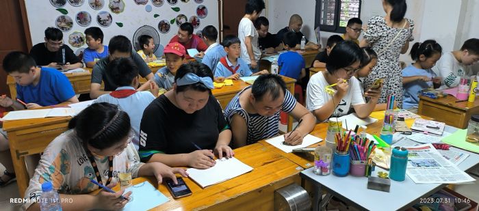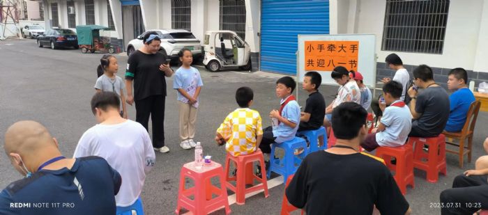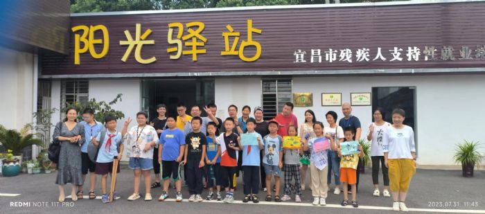 2023年7月31日上午,一群小志愿者来到宜昌市残疾人支持性就业培训基地—阳光驿站,和学员们一起迎接八一节的到来。